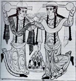 Two Iranian dancing girls are wearing caps in the left picture. (Wall painting Jausak palace, Samarra, Iraq, 836-9) They seem to be non-rigid in structure and conform to the shape of the head. The picture to the right has several women wearing caps and braids. (The frontispiece to the Kitab al-Aghani showing a ruler with attendants, Iraq, c. 1218-19.) Their caps seem similar in structure to the dancing girls.