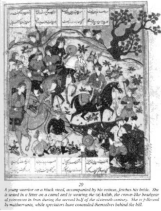 The picture to the left shows the arrival of an Iranian princess riding in a litter wearing a “crown hat”. The painting to the right features an Iranian princess (Seated Princess, Persia, c. 1540) also wearing the crown hat.